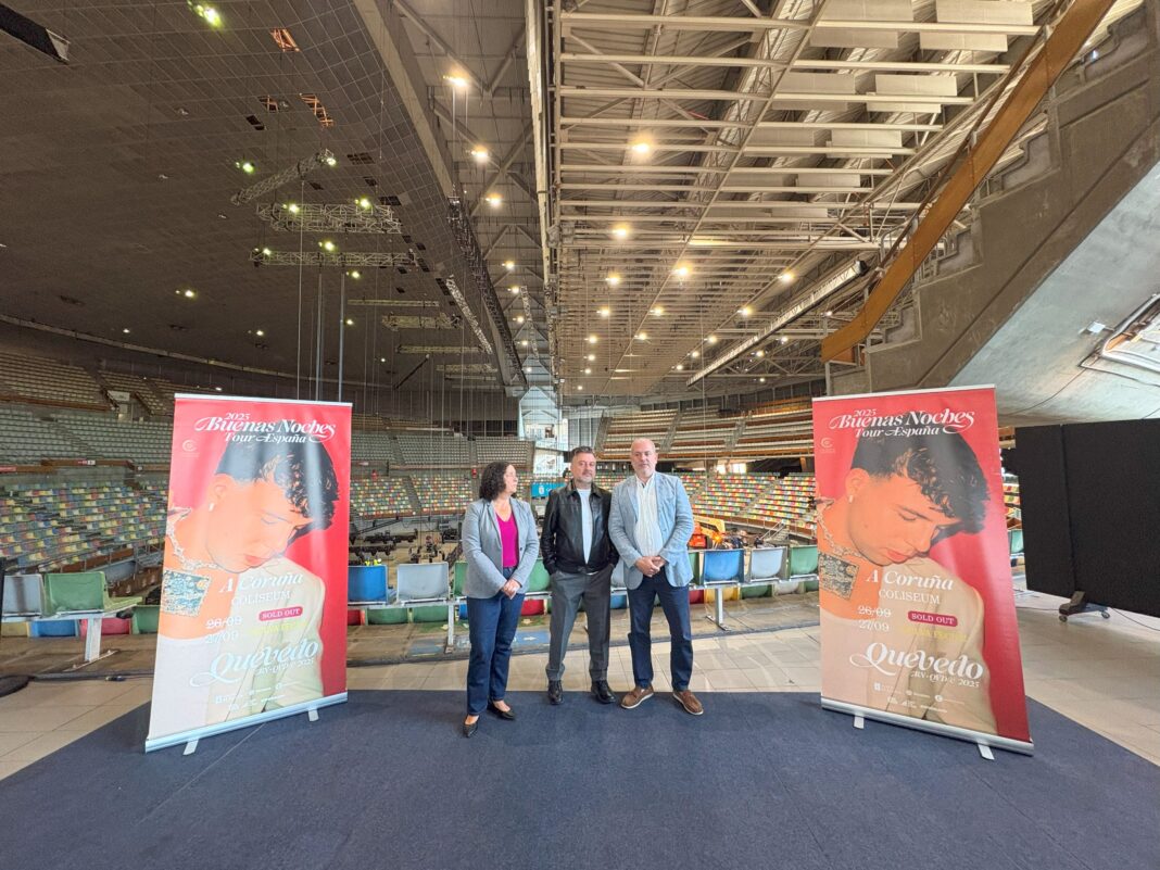 Máis de 21.000 persoas asistirán aos directos de presentación de ‘Buenas Noches’, o novo disco de Quevedo, os días 26 e 27 de setembro no Coliseum da Coruña. O recinto cambiará a súa disposición habitual para se transformar nun espazo que acolla o espectacular escenario 360º da xira e que permitirá ao público estar arredor do mesmo, de forma circular, ocupando a totalidade das localidades dispoñibles. O concelleiro de Cultura e Turismo, Gonzalo Castro, participou na presentación deste espectáculo. “Coa chegada desta xira á cidade queda demostrado que contamos cun dos mellores recintos multiusos do país, capacitado para calquera tipo de montaxe e que desde o Goberno de Inés Rey impulsamos cunha programación musical ecléctica e de primeiro nivel”, indicou.