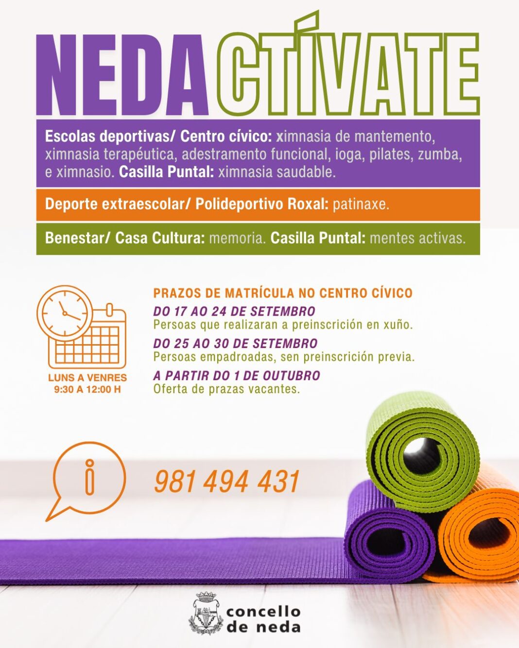 O Concello de Neda inicia este mércores, de forma graduada, as inscricións no centro cívico para as escolas deportivas e de benestar municipais. E faino, mentres entra na súa recta final o proceso administrativo de adxudicación do servizo de xestión e impartición das actividades. A programación, con propostas para o público adulto, pero tamén para a xente miúda, arrancará o 1 de outubro.