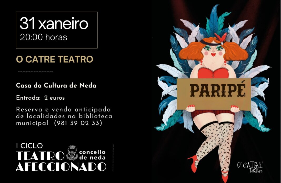 Terceira entrega do Ciclo de teatro afeccionado Concello de Neda. Tras estrearse cunha traxedia clásica- “Bacantes” e seguir cunha versión libre de Luces de Bohemia, a proposta municipal explora novos xéneros. Este sábado, a partir das 20 horas, chega á vila “Paripé, o cabaré!”, un espectáculo de varietés, que promete entretemento e diversión.