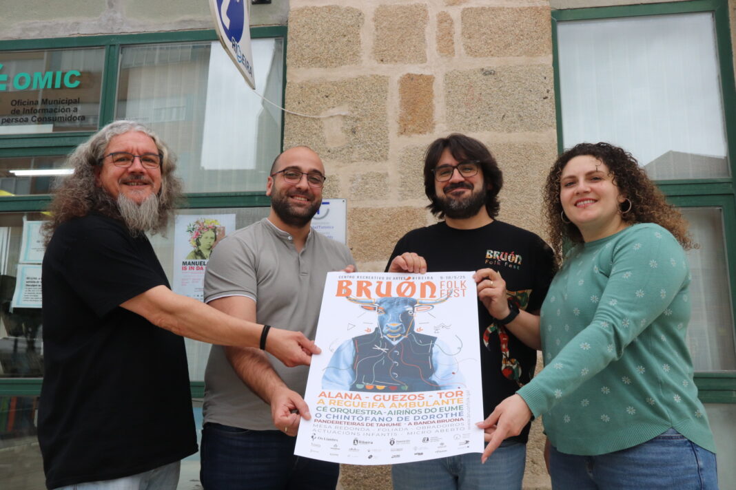 Hoxe presentouse esta segunda edición do Bruón Folk Fest 2025 coa presenza do segundo tenente de alcalde, Francisco Suárez-Puerta, a concelleira de Cultura, Antía Alberte, Ventura Otero, o secretario da Asociación os Liantes máís Jorge Maño, tamén compoñente da asociación.