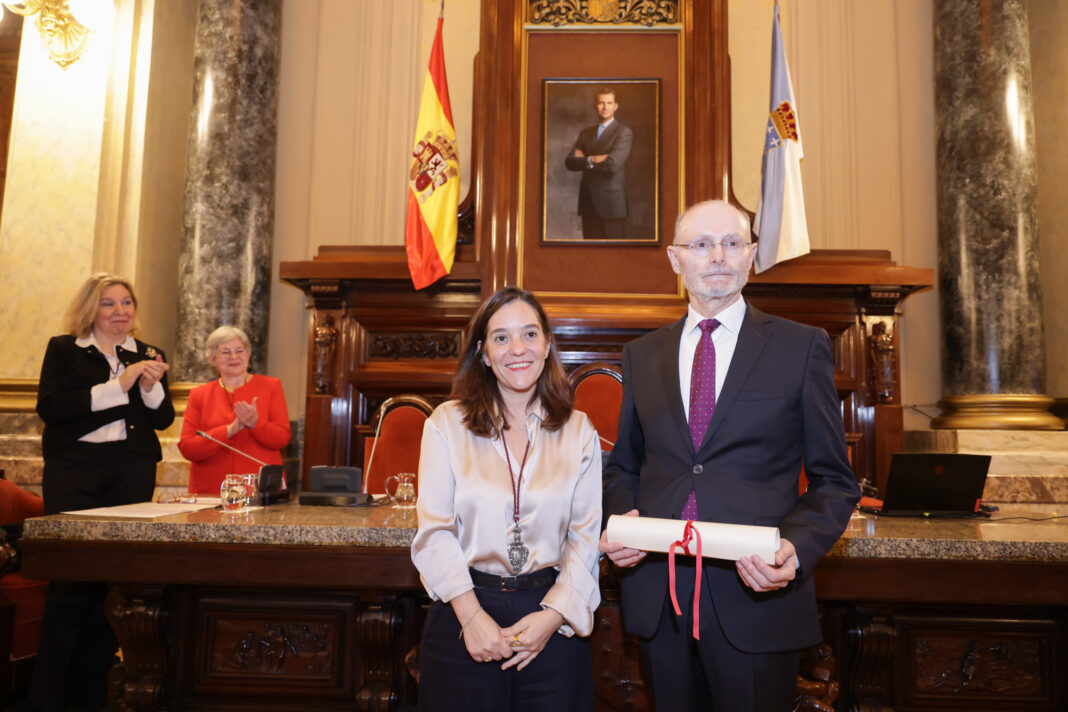 O Salón de Sesións do Palacio de María Pita acolleuesta tarde a cerimonia de ingreso do historiador Alfredo Vigo Trasancos no Instituto José Cornide de Estudos Coruñeses. A alcaldesa, Inés Rey, presidiu o acto e destacou o Palacio de María Pita como o “quilómetro cero da cidade e tamén do seu coñecemento e razón, tan ben representado nesta tarde de febreiro”. Estivo acompañada polo concelleiro responsable da área de Cultura, Gonzalo Castro e Ana Romero Masiá, directora do Instituto José Cornide de Institutos Coruñeses.