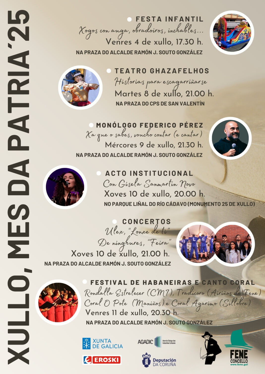 Cunha festa infantil a cargo de La Guagua botará a andar o venres 4 de xullo, ás 17.30 horas, o ciclo “Xullo, mes da Patria”, organizado pola Concellería de Cultura de Fene. Nesta primeira cita, dirixida aos máis pequenos da casa, haberá inchables, xogos de auga e animación na Praza do alcalde Ramón José Souto González, escenario de boa parte das actividades. Ese mesmo día pola mañá, a partir das 10.00 horas, repartiranse na Casa da Cultura de Fene as invitacións para asistir ao espectáculo que ofrecerá o monologuista Federico Pérez o mércores 9. Entregaranse dúas entradas por persoa adulta até completar o aforo.