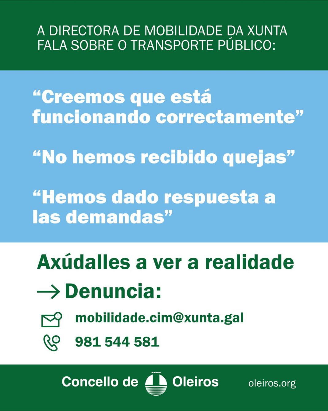 Ante as insultantes declaracións realizadas esta mañá nunha emisora de radio por parte da máxima responsable do transporte da Xunta de Galicia nas que dicía que “creemos que está funcionando correctamente”, “no hemos recibido quejas” ou “hemos dado respuesta a las demandas”; o Concello de Oleiros fai un chamamento a toda a cidadanía afectada polo pésimo servizo de transporte público na comarca da Coruña a que denuncie a situación ante a Xunta de Galicia. O correo electrónico ao que dirixir as denuncias é mobilidade.cim@xunta.gal e o teléfono é o 981 544 581.