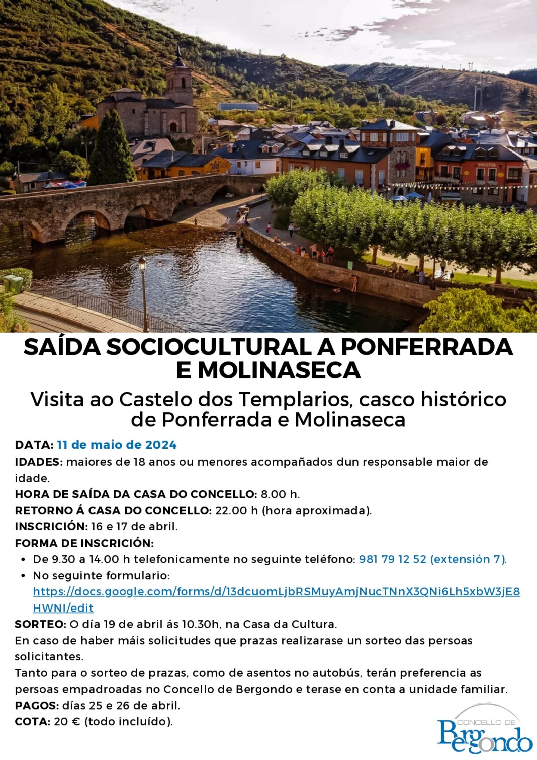 O Concello de Bergondo, no marco da súa programación de viaxes socioculturais para veciñas e veciños de municipio, organiza o próximo día 11 de maio unha saída a Ponferrada e Molinaseca.