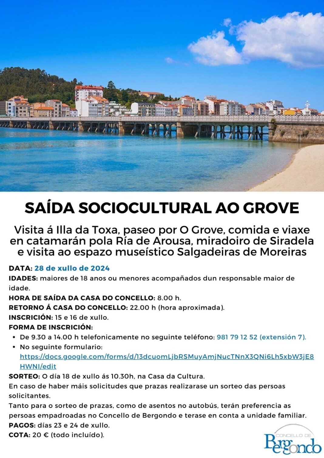 O Concello de Bergondo, no marco da súa programación de viaxes socioculturais para veciñas e veciños de municipio, organiza o próximo día 28 de xullo unha saída ao Grove.