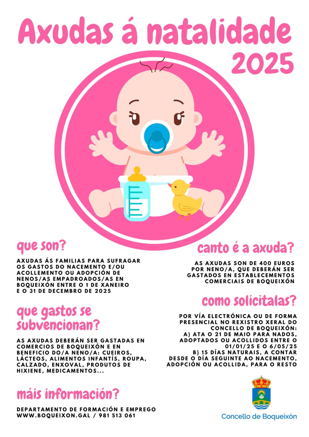 Durante o exercicio 2024, o Concello de Boqueixón concedeu un total de 9 axudas, por un importe de 3.600 euros. Os cartos da axuda poden ser gastados en produtos para o neno/a: cueiros, lácteos e alimentos infantís, roupa, calzado, enxoval, produtos de hixiene infantil, medicamentos ou calquera outro tipo de produtos receitados polo facultativo de pediatría. Uns produtos que deberán ser adquiridos en establecementos comerciais emprazados en Boqueixón.