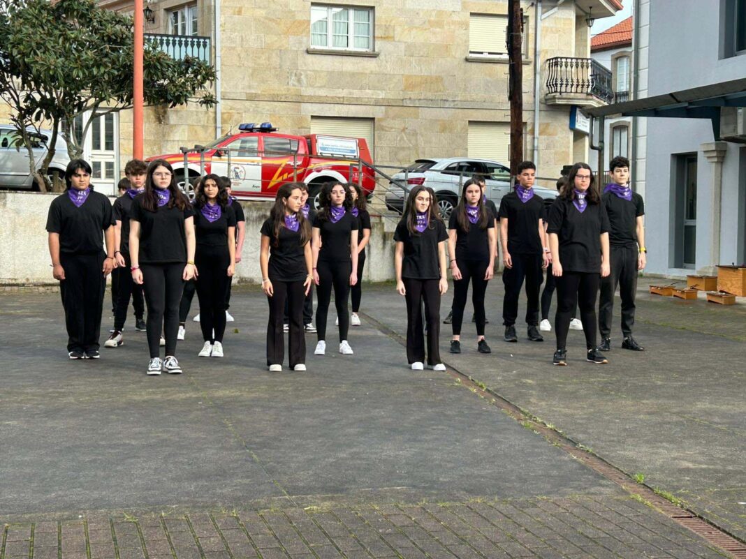 Acto seguido, un grupo de rapazas e rapaces de Teatro das Maniotas, totalmente vestidos de negro coa excepción duns panos violetas coa lenda “Brión a prol do bo trato” nos seus pescozos, realizaron unha espectacular coreografía que foi moi aplaudida polas persoas presentes no acto.