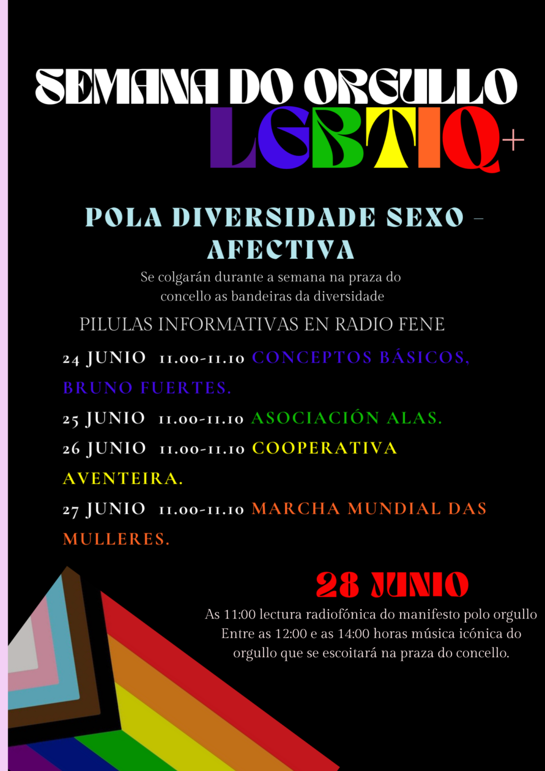 Entre o 24 e o 28 de xuño divulgaranse pílulas informativas a través de Radio Fene, e durante toda a semana ondearán na Praza do Concello as bandeiras da diversidade