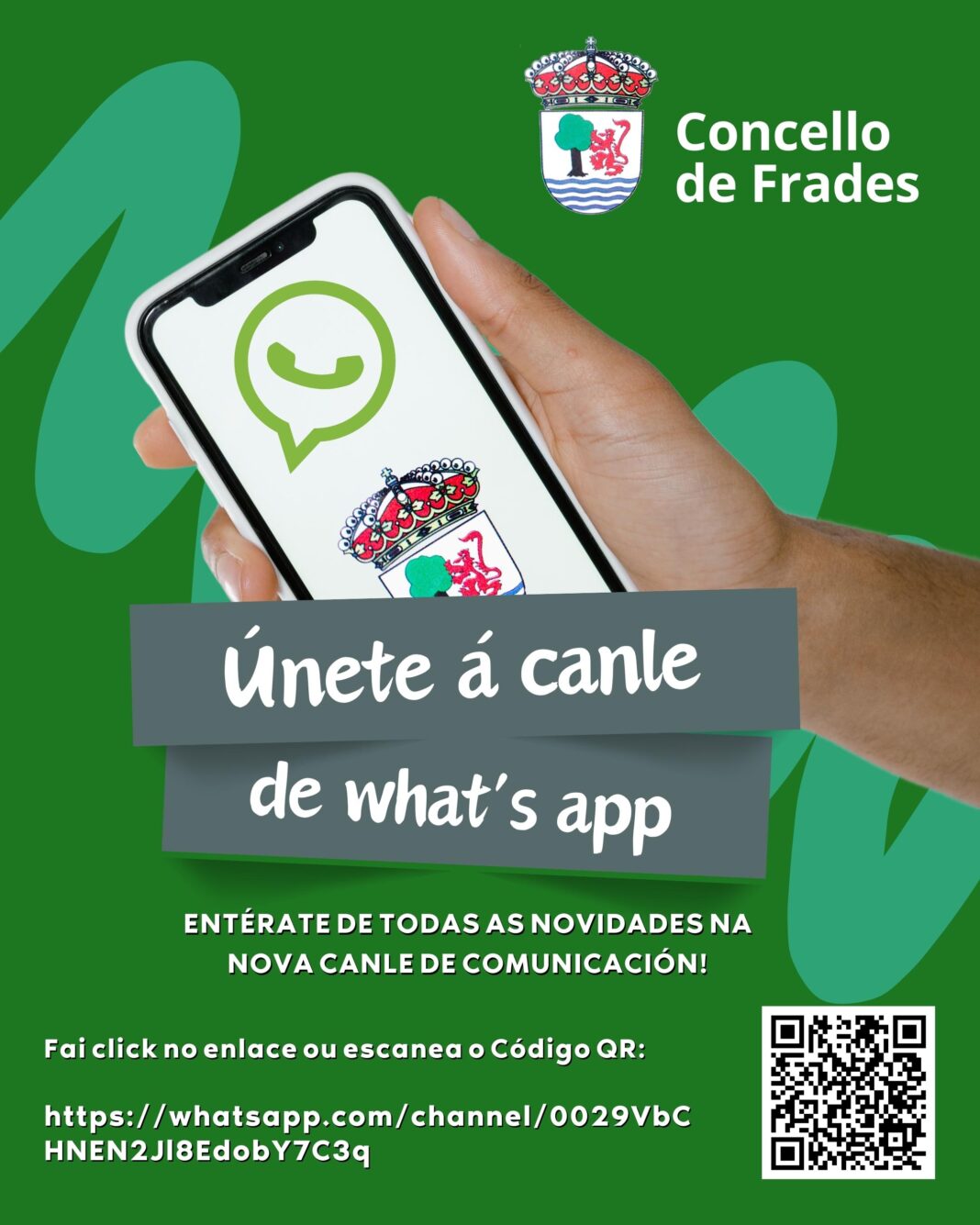 O Concello de Frades vén de poñer en marcha hoxe unha nova vía de comunicación coa veciñanza: unha canle de What’s App no que os veciños e veciñas estarán informados de todas as actividades sociais, culturais e deportivas do municipio, bandos municipais, convocatorias, avisos relevantes e novas relacionadas co municipio. Unha información que recibirán de forma inmediata no seu teléfono móbil todas aquelas persoas que o desexen.