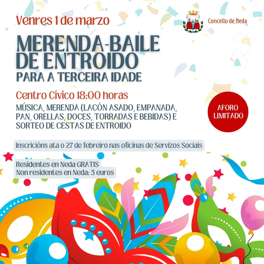 O Concello de Neda pechará a programación do Entroido 2024 coa Merenda-Baile para a Terceira Idade. Será o venres 1 de marzo no Centro Cívico Ramón Millarengo, a partir das 18:00 horas. Ao contar con aforo limitado, a Administración local abría a inscrición para reservar praza a través do departamento municipal de Servizos Sociais -na casa consistorial-. Alí, de luns a venres e ata o 27 de febreiro ou completar aforo, poderán retirarse os tickets. Gratis para os veciños e veciñas de Neda, e cun custe de 5 euros para aqueles que non residan no municipio.