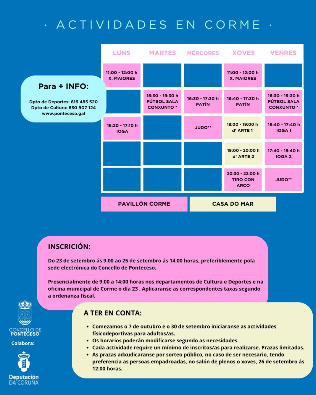 As persoas interesadas en matricularse para o vindeiro curso poderán facelo desde o 23 ata o 25 de setembro, preferiblemente de xeito telemático a través da sede electrónica. Ao longo do día 23 de setembro, poderá facerse de xeito presencial, en horario de 09 a 14 horas, tanto nos departamentos de Cultura e Deportes como na oficina municipal de Corme. Aplicaranse as correspondentes taxas segundo a ordenanza fiscal.