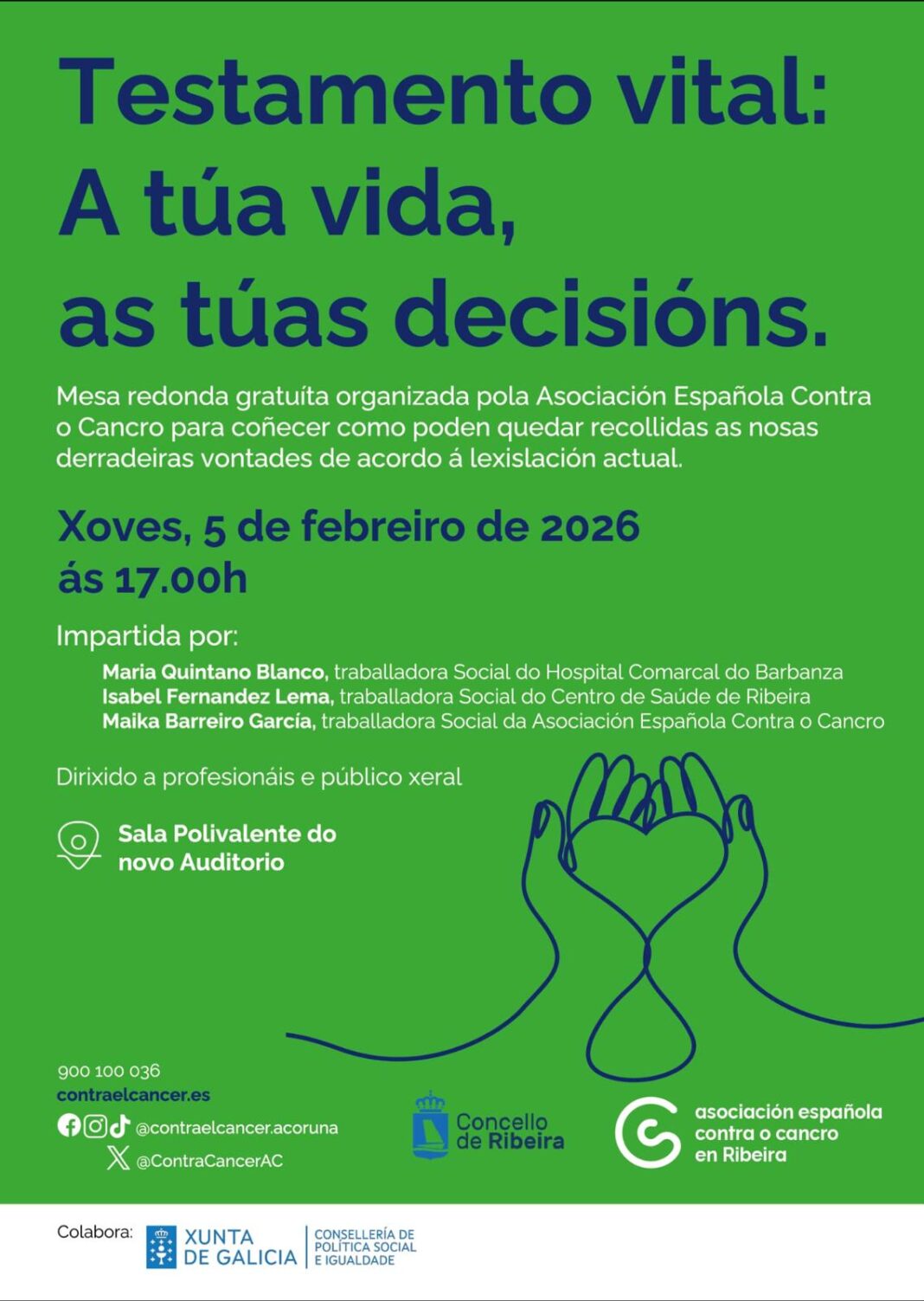 A alcaldesa referiuse tamén ao programa de actividades que se desenvolverá durante todo o mes de febreiro e que inclúe eventos como a campaña de ‘Brazaletes Solidarios’, que terá lugar as fins de semana do 30 de xaneiro ao 1 de febreiro de 2026 e a fin de semana do 6 ao 8 de febreiro, e na que asociacións e clubs deportivos de Ribeira portarán eses días nos seus partdios un brazalete verde que simbolice o apoio aos miles de pacientes e familias que enfrontan a enfermidade.