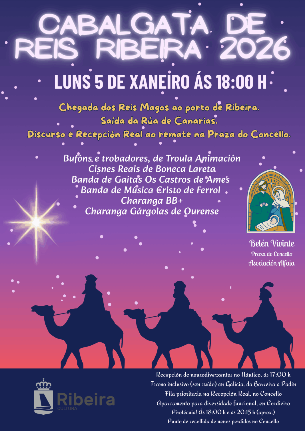 E, ás 18.00 horas, as Súas Maxestades os Reis Magos do Oriente chegarán nas dornas ao porto de Ribeira, da man da Real e Ilustre Cofradía da Dorna, para saír dende a rúa de Canarias e percorrer o centro da cidade na tradicional cabalgata que será inclusiva en colaboración coa Asociación Galega para o Acompañamento Persoal e Educativo (Ágape). Ao final, pronunciarán o seu discurso e recibirán á rapazada dende a praza do Concello.