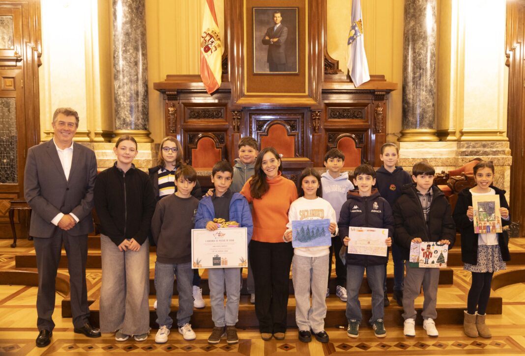 A alcaldesa, Inés Rey, presidiu esta tarde o acto de entrega dos premios do Concurso de Postais de Nadal 2025 en María Pita. Rey, acompañada do concelleiro de Educación, Formación e Innovación Tecnolóxica, recoñeceu o traballo dos rapaces e rapazas dos 9 centros educativos participantes a través do que se recibiron un total de 46 debuxos elaborados por alumnado de 5º e 6º de Educación Primaria.