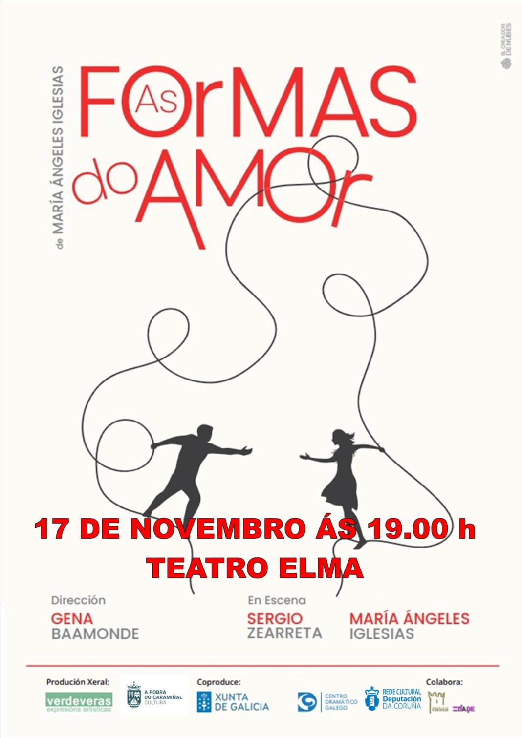 Verdeveras Expresións Artísticas convida á reflexión no domingo 17, ás 19.00 horas, con As formas do amor: el e ela foron parella; foron deses amores inesquecibles que marcan un antes e un despois na vida porque poñen todo patas arriba e, logo de tanto tempo de separación, tal vez sexa o día xusto para atoparse novamente pola primeira vez.