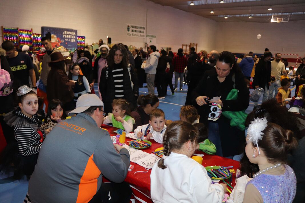 Mentres tanto, o polideportivo municipal Pilar Barreiro Senra era unha gran festa, cunha zona de música coa rapazada xogando e correndo; unha zona central con catro grandes inchables; e unha terceira área onde se podían recoller as orellas e as filloas, ou tamén mercar chocolate con churros nun posto da Churrería Rafa. Mentres tanto, os máis maiores ateigaban o graderío do pavillón, degustando os doces, parolando e desfrutando dos xogos de cartas do mago Charly Braun, quen presentou o Desfile de Disfraces no que tomaron parte case noventa persoas.