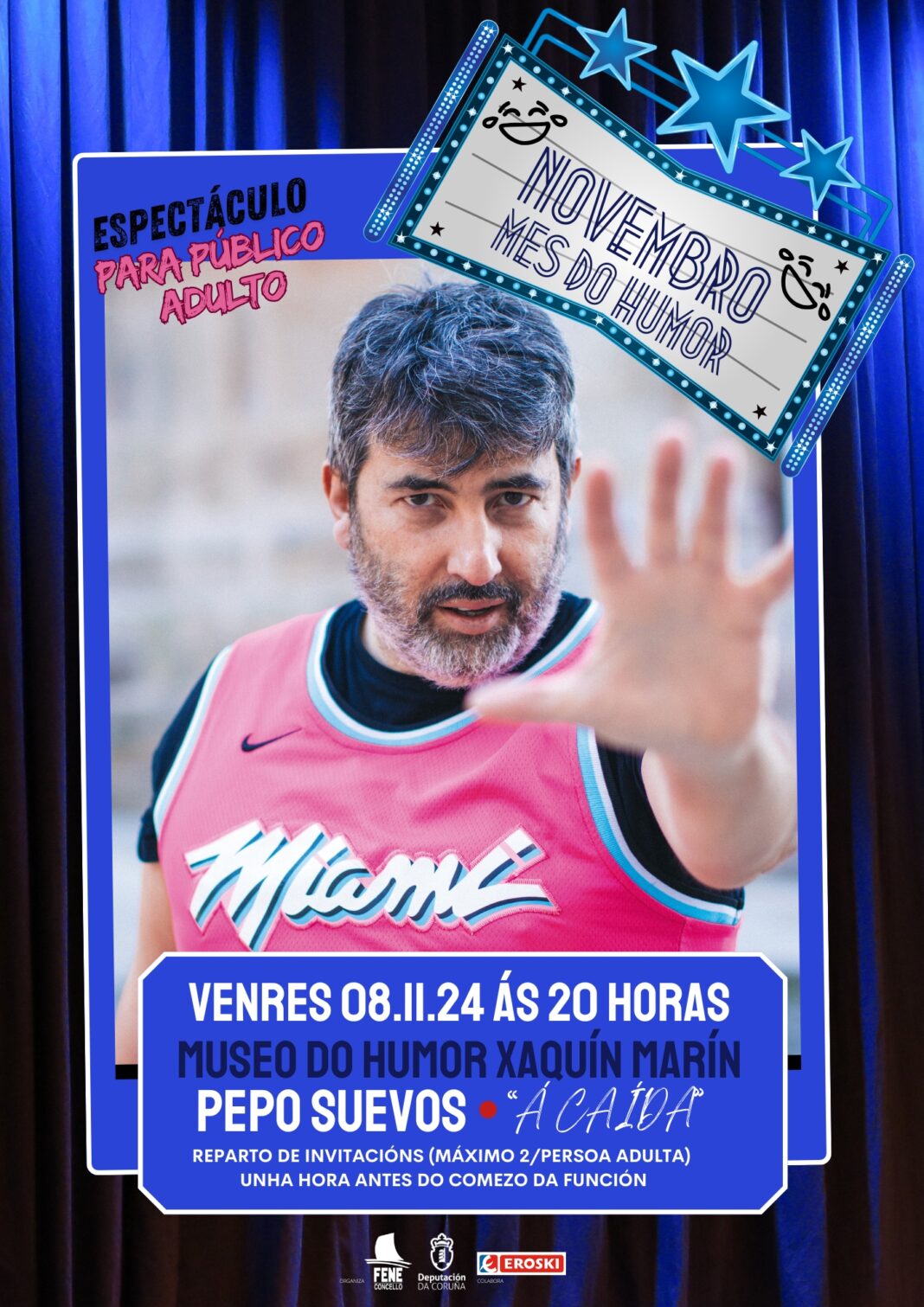 A primeira actuación do “Novembro, mes do humor”, o venres 8 de novembro, correrá a cargo do humorista e actor ferrolán Pepo Suevos cunha función titulada “Á caída”. Trátase dun espectáculo “totalmente improvisado e interactivo, no que a información que ofreza o público será a que irá compoñendo o contido, así que no caso de tocar temas escabrosos, o público será o culpable (ou cando menos, cómplice). E por suposto, se se tratan os temas “de sempre”, será o auditorio o que peque de pouco orixinal, e nunca o tipo do escenario, que ten que estar áxil e receptivo para que a pelota non caia ó chan. Así que Pepo Suevos recolle todo isto e presenta un show aberto, atrevido, arriscado e sobre todo, moi divertido, no que cada función será única, xa que todo o que aconteza durante o espectáculo, irá xurdindo Á Caída”.