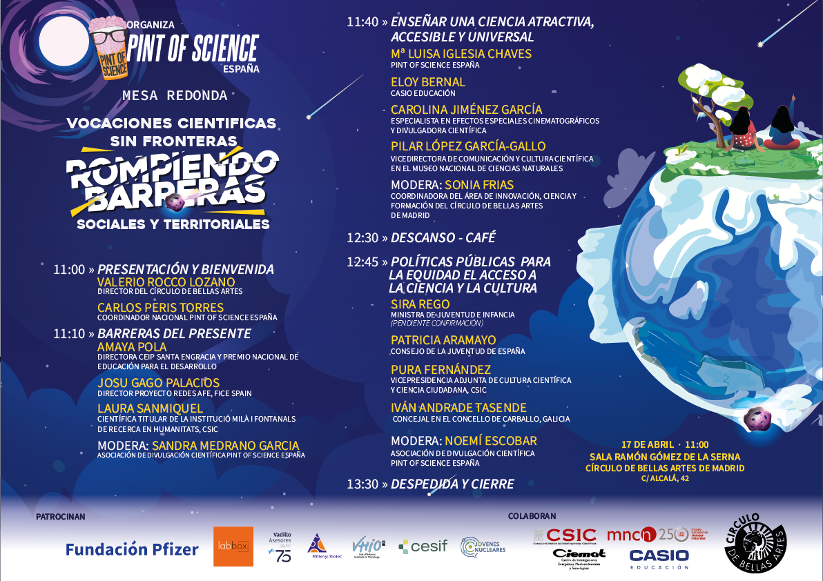 A democratización do coñecemento e o acceso á ciencia fóra das grandes capitais serán os eixes centrais da mesa redonda Vocacións científicas sen fronteiras: rompendo barreiras sociais e territoriais, organizada desde Pint of Science España, que se celebrará o venres 17 de abril no Círculo de Bellas Artes de Madrid.