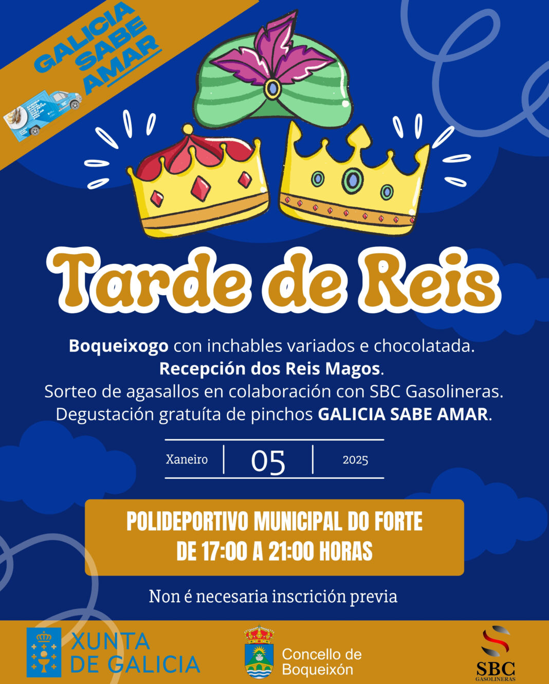 O polideportivo municipal do Forte acollerá este domingo 5 de xaneiro, de 17:00 a 21:00 horas, unha nova edición da Tarde de Reis. Unha gran festa na que Melchor, Gaspar e Baltasar estarán acompañados por outros dous eventos: o tradicional Boqueixogo e unha nova visita do foodtruck da campaña “Galicia sabe amar”. Tres eventos de acceso libre e de balde, sen necesidade de inscrición previa.