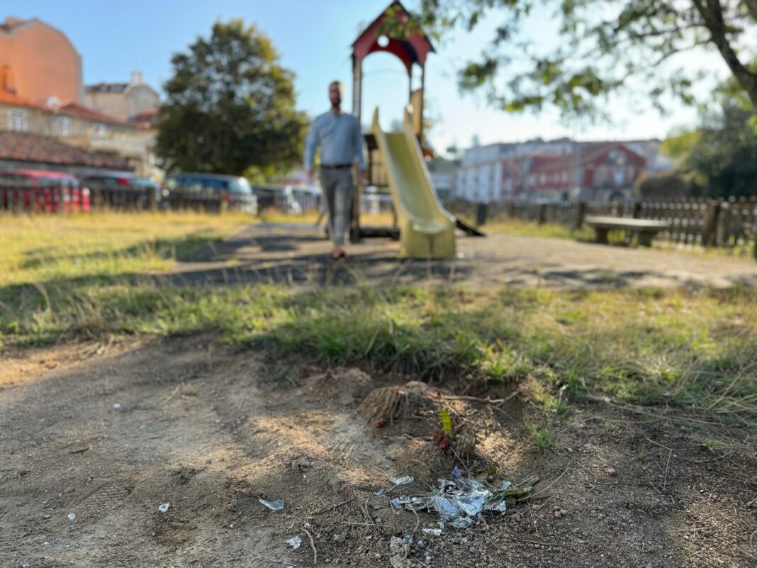 • Acuña denuncia o perigo da falta de mantemento e limpeza do Goberno local coa presenza de cristais rotos no chan do parque infantil Ribeira dous Peiraos