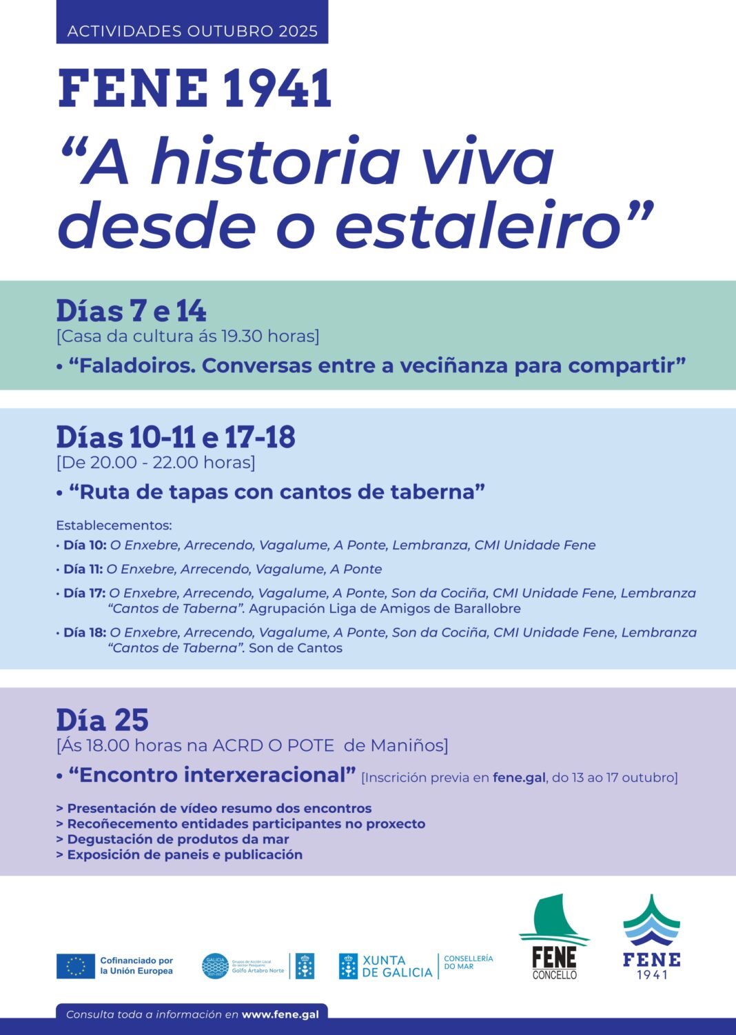 O proxecto Fene 1941 desenvólvese nos anos 2024 e 2025 e está financiado con fondos do Programa do Fondo Europeo Marítimo, de Pesca e de Acuicultura (FEMPA) a través do GALP Golfo Ártabro Norte, nun 70% pola Unión Europea e nun 30% pola Consellería do Mar da Xunta de Galiza.