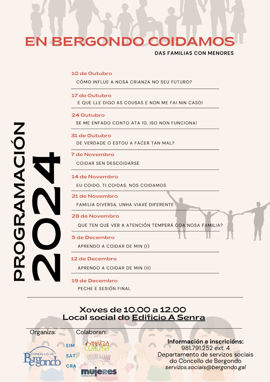 Este programa, organizado desde os Servizos Sociais Comunitarios do Concello de Bergondo, conta coa colaboración de diversas entidades especializadas na atención a mulleres, familias e menores, como ANHIDA, Dismacor, a Fundación Mujeres, o Servizo de Atención Temperá de Bergondo (SAT) e o Colexio Rural Agrupado (CRA). As sesións estarán lideradas por un equipo multidisciplinario de psicólogos, sociólogos e educadores, que proporcionarán estratexias prácticas para mellorar a vida familiar.
