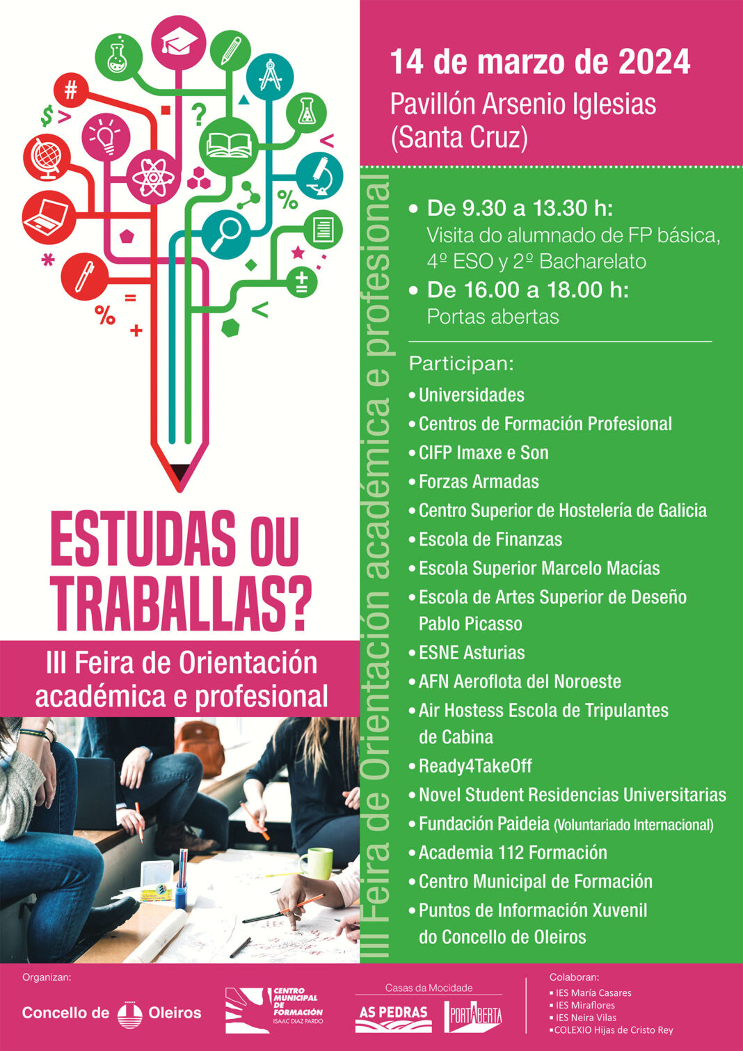 O próximo xoves 14 de marzo celebrarase no Pavillón Arsenio Iglesias de Santa Cruz, a III Feira de Orientación académica e profesional do Concello de Oleiros, dirixida ao alumnado de formación profesional, educación secundaria e Bacharelato.