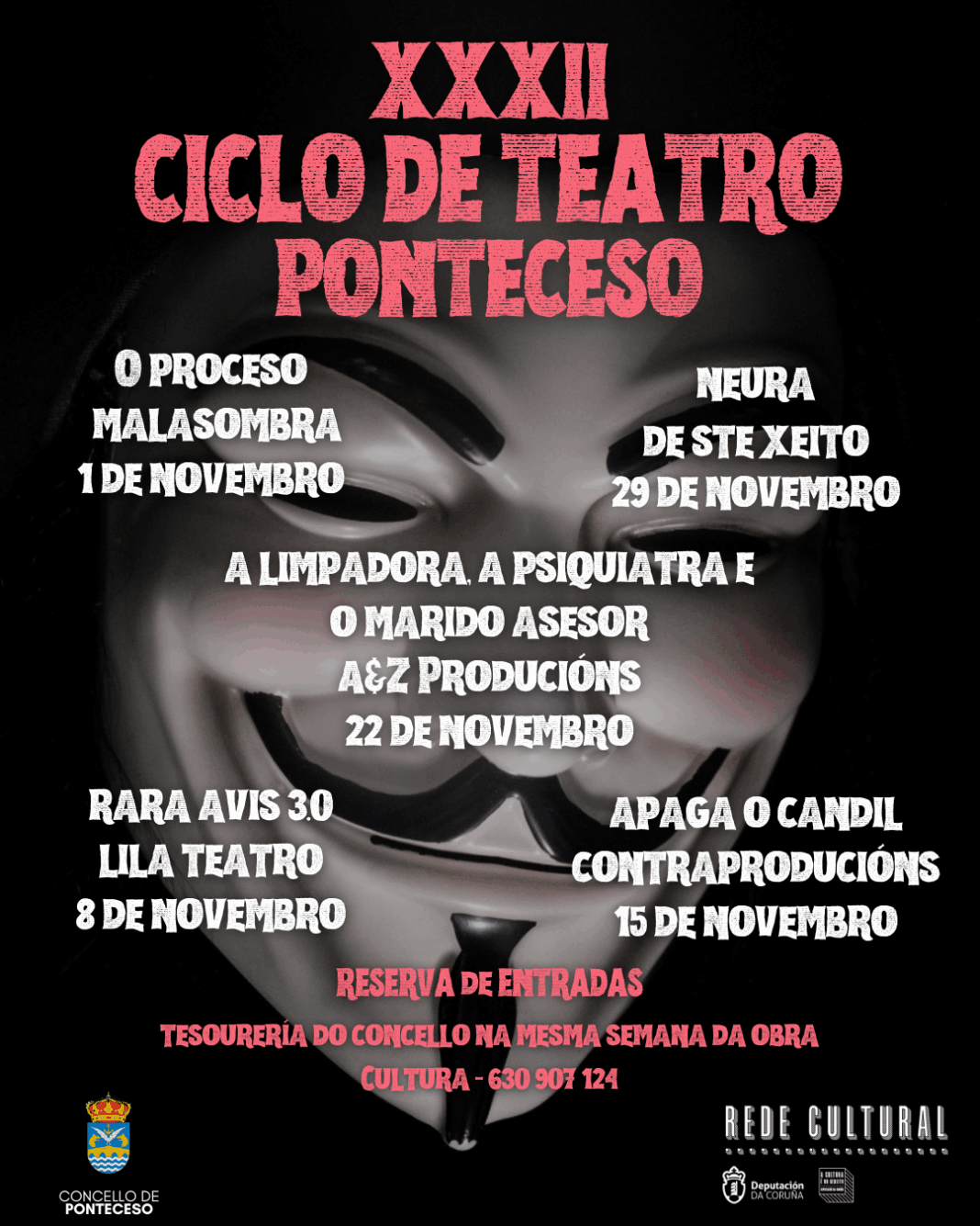 As entradas poderán reservarse na Tesourería do Concello durante a mesma semana de cada función e incluso o mesmo día da obra, se hai dispoñibilidade, ou a través do teléfono de Cultura (630 907 124). Desde o Concello de Ponteceso anímase á veciñanza e ao público da contorna a gozar dun mes cheo de teatro, cultura e encontro comunitario pensado para un público adulto.