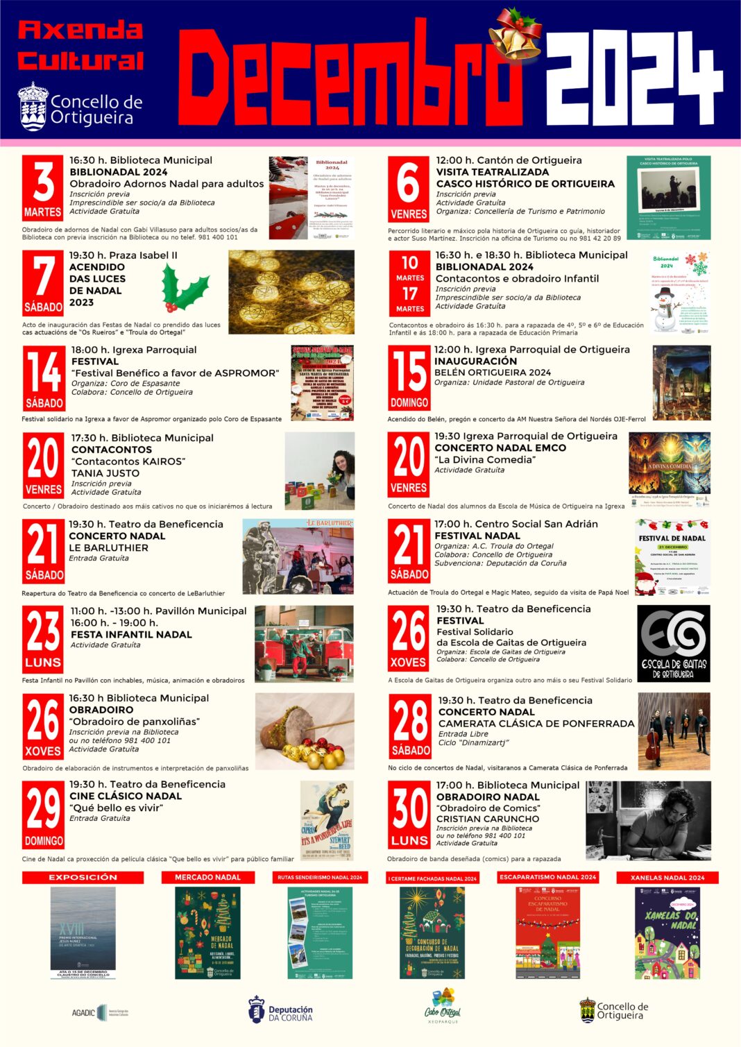 O venres 20 de decembro haberá un contacontos da man de Tania Xusto, unha iniciativa que busca promover a lectura entre as novas xeracións. Ese mesmo día, ás 19:30 h, terá lugar o concerto de Nadal da EMCO, titulado A Divina Comedia, na Igrexa Parroquial de Ortigueira.