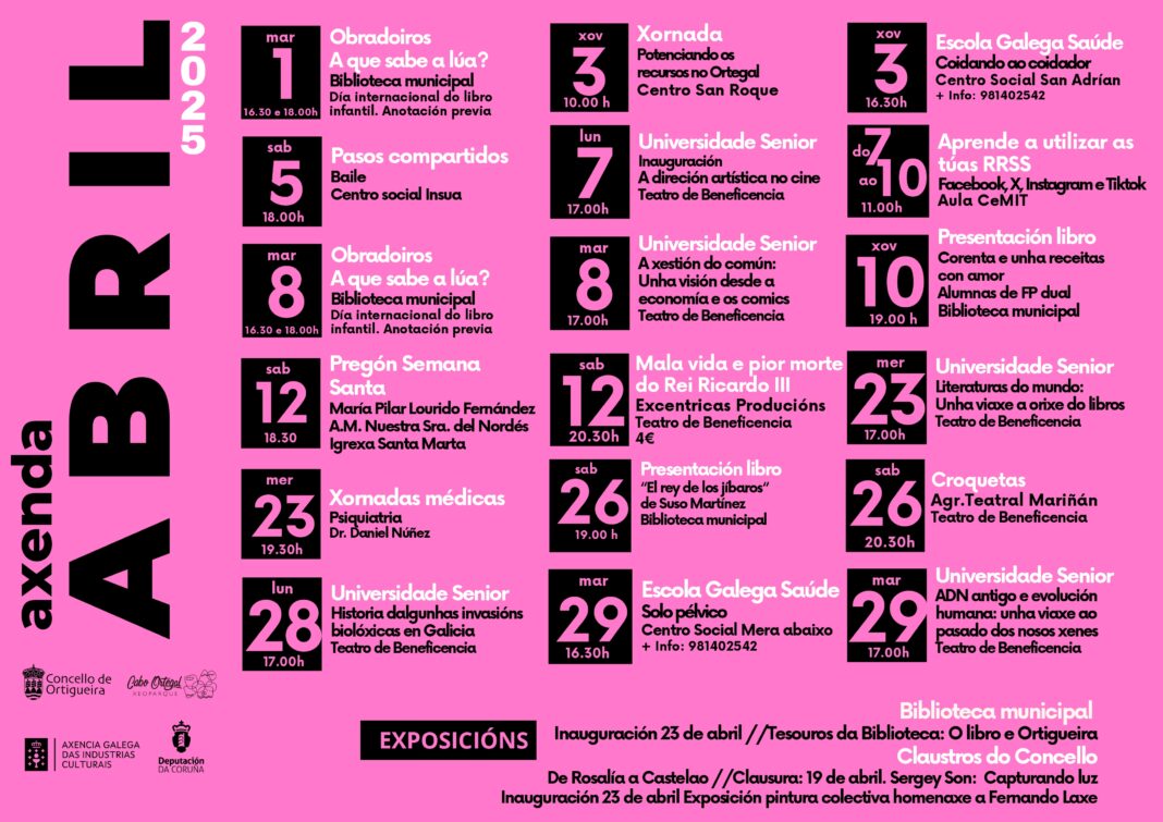 O Concello de Ortigueira deseñou unha intensa e diversa programación para o mes de abril, con actividades que abarcan teatro, literatura, formación, exposicións e encontros académicos.