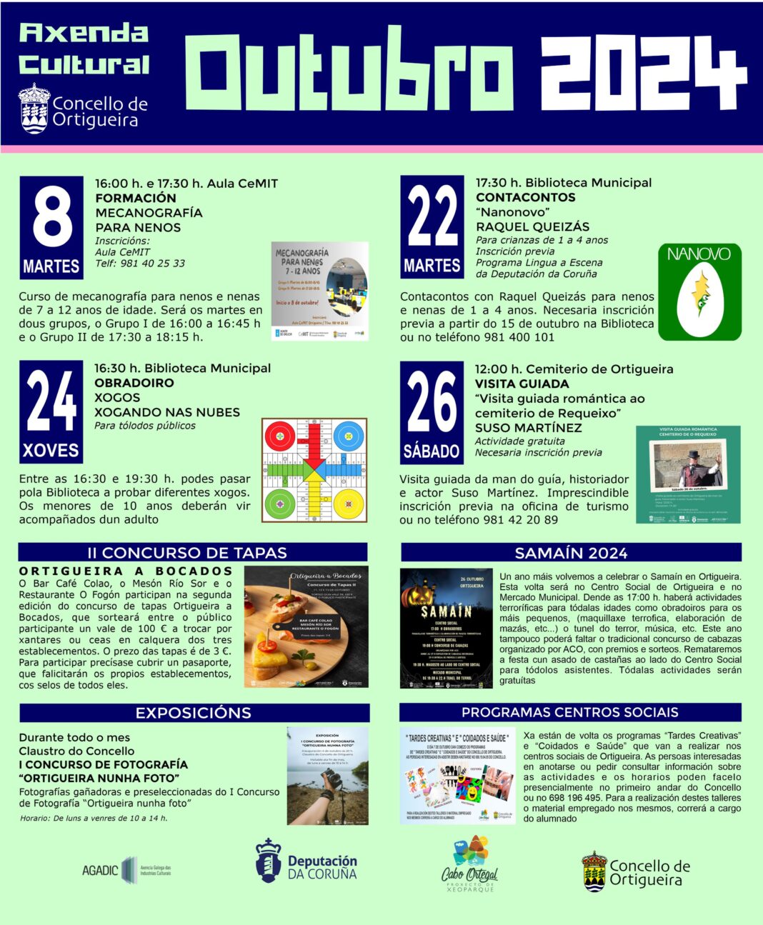 O Concello de Ortigueira deu a coñecer a súa programación cultural para o mes de outubro de 2024, cunha variada oferta de actividades que inclúe formación, xogos, narración de contos, visitas guiadas e celebracións tradicionais como o Samaín. A continuación, detállanse as principais actividades que terán lugar durante este mes en diversos espazos do municipio.