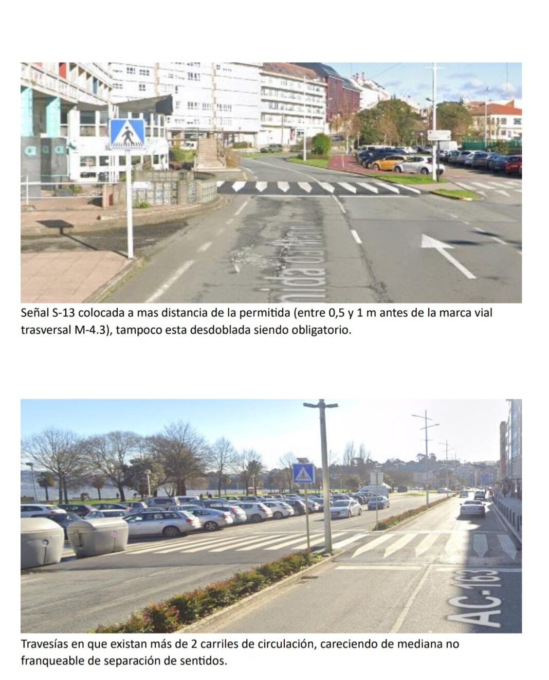 Segundo a Orde FOM/3053/2008 e a Orde FOM/534/2014, os pasos peonís sobreelevados deben cumprir con certos requisitos de deseño e seguridade. Con todo, os instalados na Avenida dá Mariña AC-163 non cumpren con estes requisitos, o que supón un incumprimento do artigo 5 do RD 1428/03.