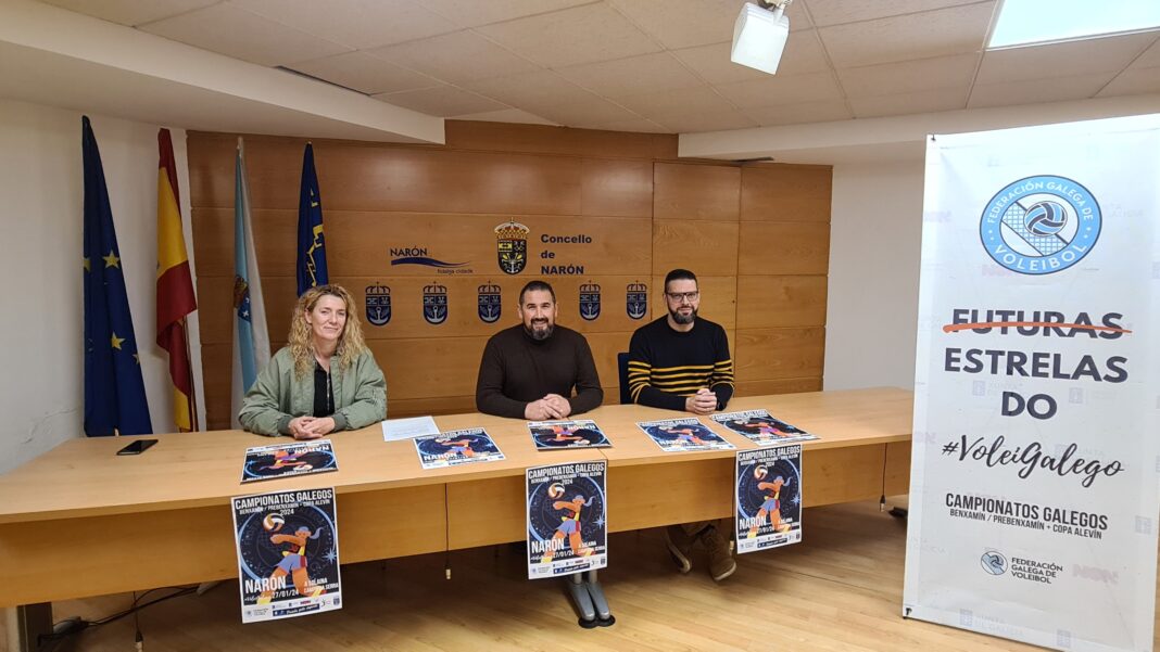 O concelleiro de Deportes, Ibán Santalla, presentou esta mañá xunto co secretario da Federación Galega de Voleibol, Ramón Baña, e a presidenta do club Narón Volea, Eva Romero, os “Campionatos galegos de voley” que se celebrarán este sábado, día 27, no pavillón Campo da Serra e no do colexio da Solaina. A cita dará comezo ás 9:30 horas e o remate está previsto sobre as 20:00, tal e como indicaron dende a organización.