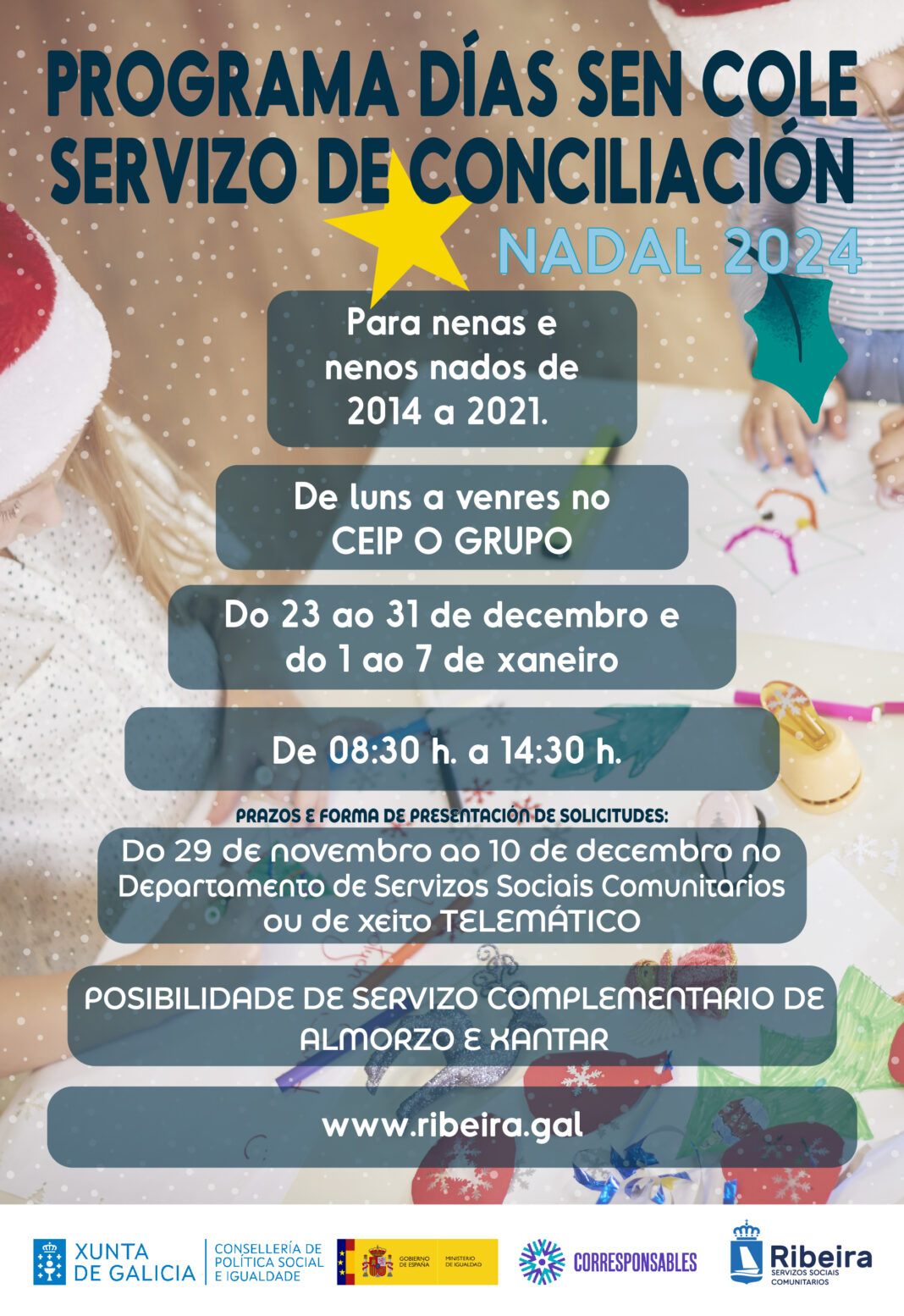 O programa de conciliación celébrase dende hai anos como unha programación estable adquirindo grande demanda e satisfacción cidadá. Nesta ocasión, éde interese da área dos Servizos Sociais Comunitarios impulsar o programa de conciliación durante as vacacións do Nadal 2024, coincidindo coas datas das vacacións escolares, de luns a venres –excepto festivos- de 08:30 a 14:30 horas e destinados a nenos e nenas de 3 anos (escolarizados) a 10 anos co obxectivo de que os máis novos pasen unhas vacacións de ocio e divertimento, aprendendo contidos de todo tipo e en ámbitos relacionados coa cultura, igualdade, o medio ambiente ou as novas tecnoloxías…