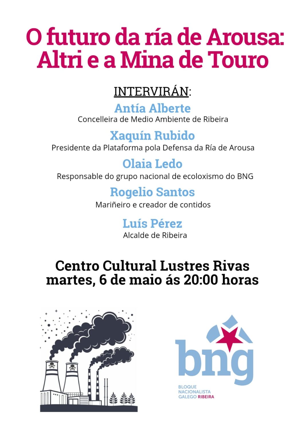 O Centro Cultural Lustres Rivas de Ribeira acollerá o vindeiro martes 6 de maio ás 20:00 horas un acto informativo aberto ao público centrado nos efectos ambientais que pode ter a instalación da macrocelulosa de Altri e a Mina de Touro para a Ría de Arousa.