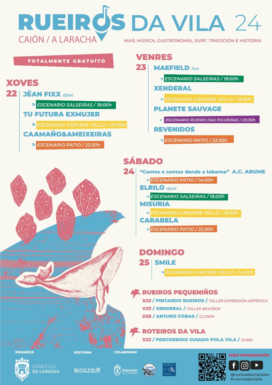Do mesmo xeito que en anos anteriores, haberá catro escenarios ao longo da vila nos que se realizarán os concertos, espectáculos de rúa e obradoiros: Escenario Patio (finca entre a igrexa parroquial e o paseo marítimo), Escenario Cárcere Vello (paseo marítimo), Escenario Salseiras (zona verde xunto ao acceso principal á praia) e Escenario Rueiro das Figueiras (praza Virxe dos Milagres).