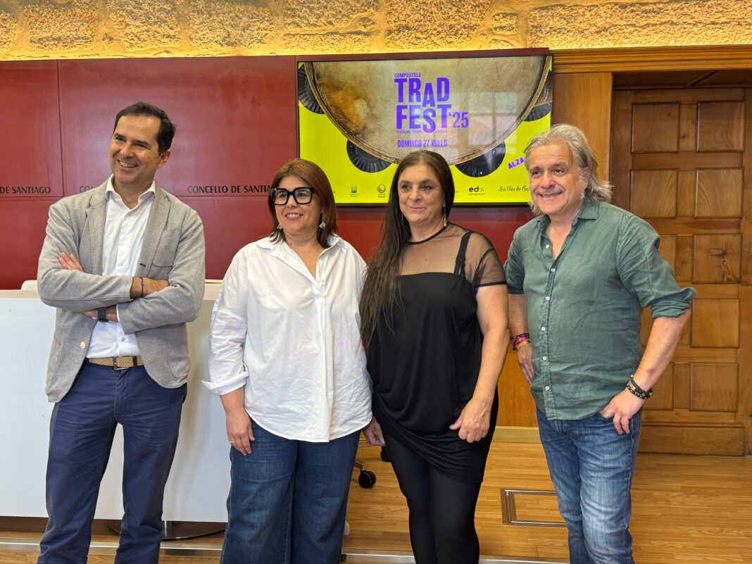 A concelleira de Festas, Pilar Lueiro, compareceu este mércores acompañada do promotor Vítor Belho, Felisa Segade do grupo Tres Pesos e do director de Agadic, Jacobo Sutil, para presentar a sétima edición do TradFest, que terá lugar o próximo domingo 27 de xullo. Baiuca e Tres Pesos serán os grupos encargados de poñerlle o ramo na Praza da Quintana a unha xornada que congrega música, artesanía e conversa. Este evento está promovido polo Concello de Santiago e La Voz de Galicia e producido por aCentral Folque e Nordesía.