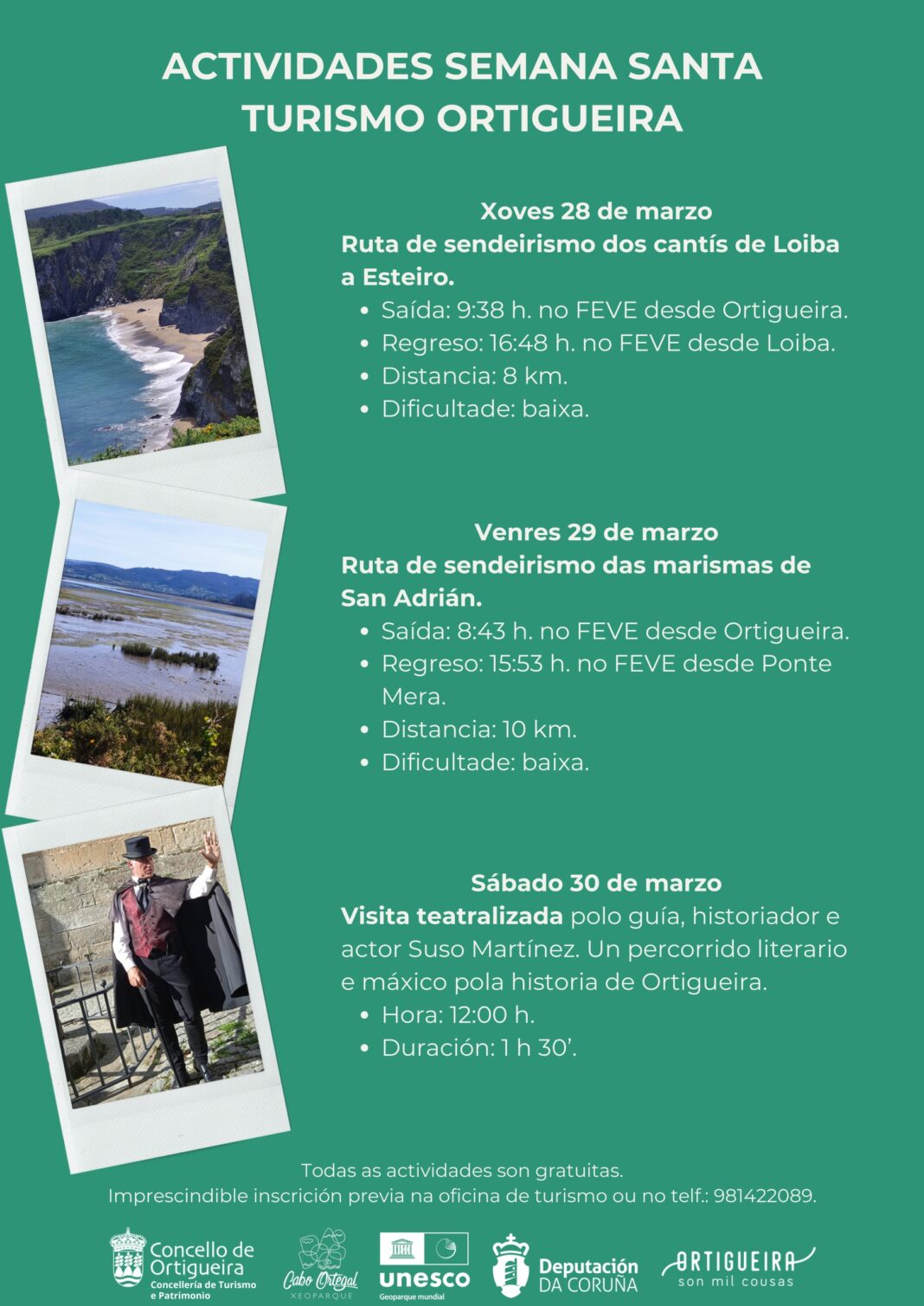 O Concello de Ortigueira propón un plan alternativo turístico para a Semana Santa. A Concellería de Turismo e Patrimonio organiza tres eventos, coincidindo co Xoves e Venres Santo, 28 e 29 de marzo, e o sábado 30. Trátanse de dous roteiros de sendeirismo e unha visita teatralizada.