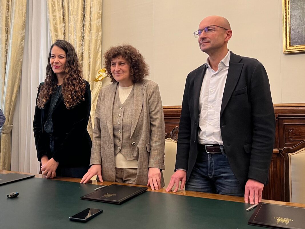 Goretti Sanmartín, en representación do Grupo Municipal do Bloque Nacionalista Galego, María Rozas, en nome do Grupo Municipal de Compostela Aberta, e Gonzalo Muíños, en representación do Grupo Municipal Socialista, asinaron este martes o acordo para osorzamentos municipais de 2025.