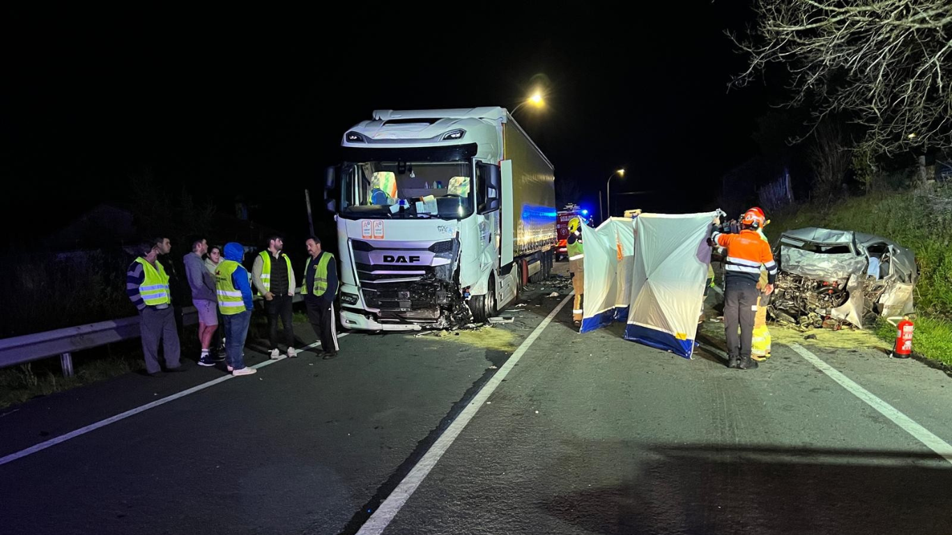 Onte á noite os bombeiros do parque provincial de Boiro atenderon o aviso dun accidente na estrada AC544 no lugar de Caroubans, no concello de Ames. O turismo e o camión chocaron frontalmente, quedando resultando ileso o conductor do camión e falecida a persoa conductora do vehículo. Completaron o servizo o GES de Brión, unha ambulancia medicalizada de Santiago e Garda Civil de tráfico.