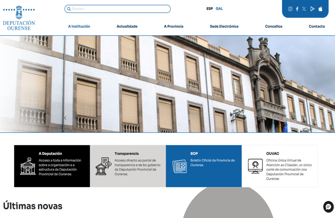 A Deputación de Ourense estrea nova páxina web (depourense.gal) co obxecto de renovar a súa imaxe, ter unha relación mais directa coa cidadanía, ofrecer novos e mellores contidos e adecuarse ás tecnoloxías emerxentes.