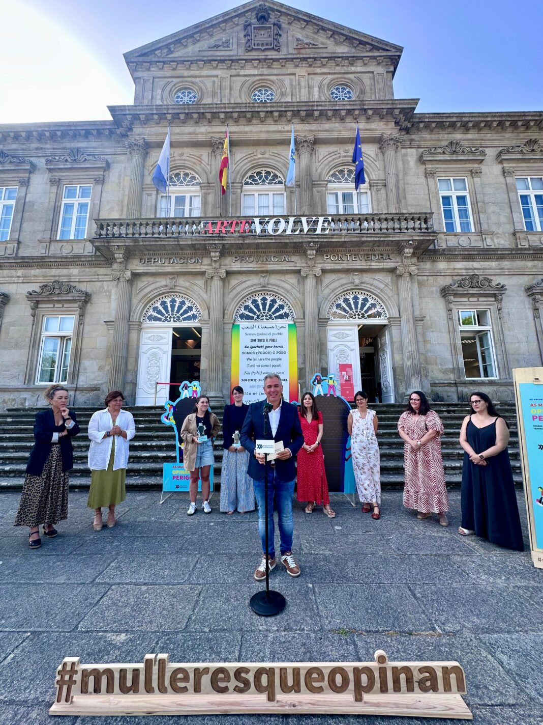 A Deputación de Pontevedra acolleu este luns no exterior do Pazo provincial o acto de entrega da terceira edición dos premios de opinión xornalística #MulleresQueOpinan, unha acción complementaria a “As mulleres que opinan son perigosas” que premia os mellores traballos sobre as temáticas que se abordaron na edición deste ano do congreso. O vicepresidente da Deputación, Rafa Domínguez, que asistiu ao acto xunto coa deputada de Igualdade, Sandra Bastos, foi o encargado de entregar os premios xunto coa concelleira de Igualdade de Pontevedra, Anabel Gulías. Estes recaeron en Dores Tembrás polo artigo “Iluminadas. A orde violeta” na modalidade en galego e en Alba Chaves Abelleira por “La mayor y la peor” na modalidade en castelán.