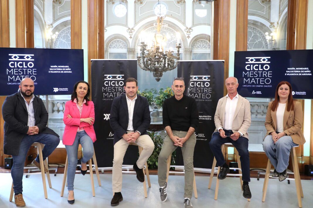 O deputado de Cultura da Deputación de Pontevedra, Jorge Cubela, presentou este xoves no Pazo provincial a nova edición do Ciclo Mestre Mateo, unha iniciativa impulsada pola institución provincial en colaboración coa Academia Galega do Audiovisual, que estivo representada polo seu vogal Milo Baños. Ao acto tamén acudiron representantes dos catro concellos onde se levarán a cabo as proxeccións este ano: Marín (a alcaldesa, María Ramallo), Mondariz (o alcalde, Pablo García), Salvaterra de Miño (a concelleira Lorena Soto) e Vilanova de Arousa (o alcalde, Gonzalo Durán).