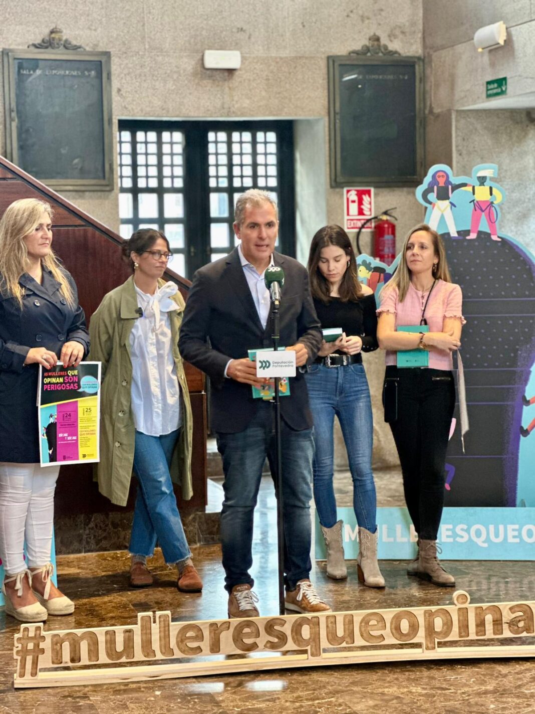 O vicepresidente Rafa Domínguez anunciou este luns que a Deputación e o Concello de Pontevedra celebrarán os próximos días 24 e 25 de outubro a conmemoración das ‘100 Mulleres Que Opinan’, as cen xornalistas que participaron entre os anos 2018 e 2025 no foro de xornalismo e opinión con perspectiva de xénero As Mulleres Que Opinan Son Perigosas. A visita de Olga Viza e Marta García Aller será o prato forte dos eventos, que se anunciaron nun dos escenarios principais deste encontro, o Teatro Principal, onde comezarán o venres 24 para continuar o sábado 25 noutro dos seus escenarios principais, o Edificio Castelao do Museo de Pontevedra. Na presentación o vicepresidente estivo acompañado polas xornalistas e creadoras do encontro, Susana Pedreira e Diana López.