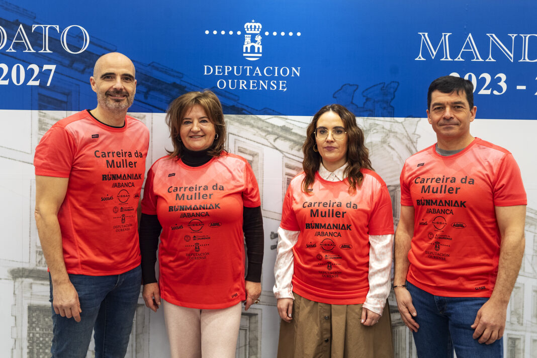 A deputada de Igualdade, Teresa Barge, participou hoxe no Pazo Provincial na presentación da camiseta oficial da Carreira da Muller, acompañada polos organizadores da proba, do Clube Runmaniak Box001 Ourense. A carreira, que conta coa colaboración de diversas institucións e colectivos, entre elas a Deputación de Ourense, é competitiva e inclusiva. O obxectivo é reivindicar o papel da muller, especialmente no deporte.