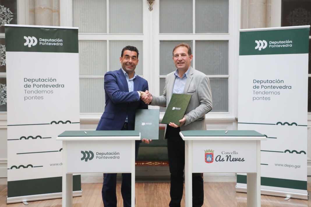 O presidente da Deputación de Pontevedra, Luis López, vén de asinar o convenio de colaboración co alcalde das Neves, Jose Manuel Alfonso, para o financiamento do proxecto de mellora da accesibilidade, acondicionamento e ampliación das instalacións deportivas municipais da área da Caíña, na parroquia de Tortoreos. Un acordo asinado no marco do Plan Extra, o novidoso plan de investimentos do goberno provincial que mobiliza ata 38 millóns de euros entre os concellos de menos de 50.000 habitantes da provincia para executar proxectos estratéxicos. No Pazo provincial, López e Alfonso selaron un acordo a través do cal o organismo provincial achega o 100% do orzamento, 575.000 euros, dos cales 488.750 euros proceden dos fondos do Plan Extra e 86.250 euros dos recursos do Plan +Provincia.
