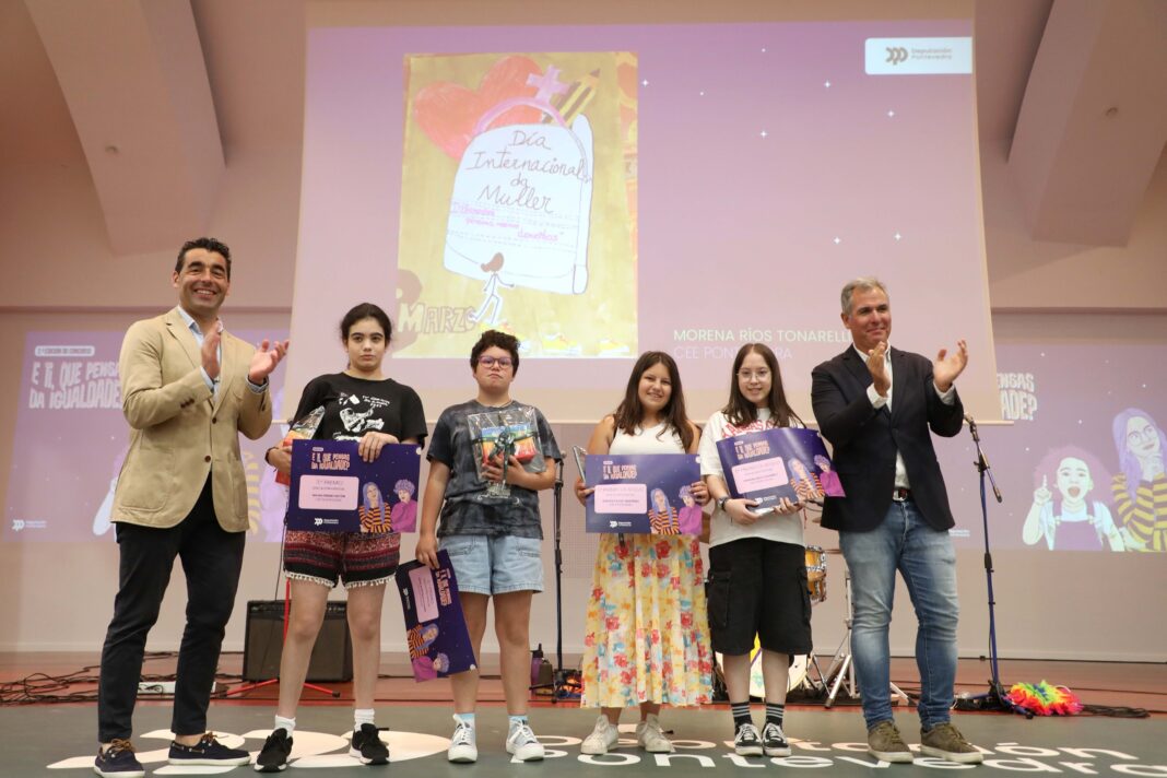 PO presidente da Deputación de Pontevedra, Luis López, entregou este luns os premios “E ti, que pensas da igualdade?”, un certame promovido polo ente provincial que na súa segunda edición volveu ser un éxito de participación, nun auditorio do centro Príncipe Felipe no que se reuniron centos de estudantes de Educación Primaria, Secundaria e Especial procedentes de centros de toda a provincia. “Ver este auditorio cheo de rapaces e rapazas de toda a provincia é unha nova fantástica. Vexo nas vosas caras, mozos e mozas comprometidísimos coa igualdade entre homes e mulleres, vexo os froitos dun concurso escolar que nesta segunda edición volve demostrar ser un completo acerto e vexo que nesta provincia, o futuro escríbese en clave de igualdade”, afirmou o presidente da Deputación despois dunha entregar de galardóns nas que tamén participaron os vicepresidentes Rafa Domínguez e Luisa Sánchez, así como as deputadas Sandra Bastos e María Ramallo.