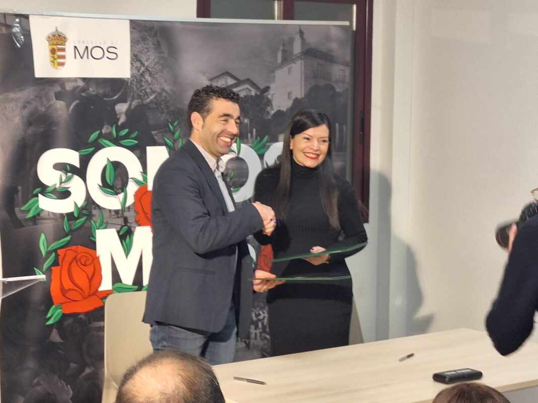 O presidente da Deputación, acompañado pola deputada de Infraestruturas, Isabel Couselo, asina coa alcaldesa de Mos, Nidia Arévalo, un convenio para construír unha senda peonil e mellorar a seguridade viaria nun treito de 1.350 metros