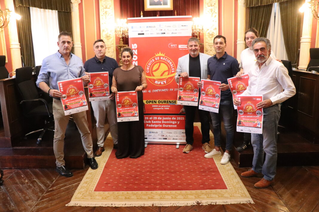 O salón de plenos do Concello de Ourense acolleu esta mañá a presentación do I Open de tenis masculino Cidade de Ourense, clasificatorio para o campionato de España absoluto, na categoría 1.000. O Concello colabora neste torneo, que organiza a Federación Galega de Tenis, co apoio de diferentes institucións e empresas, e se desenvolve até o domingo, 29 de xuño no Club Santo Domingo, con entrada libre e gratuíta.