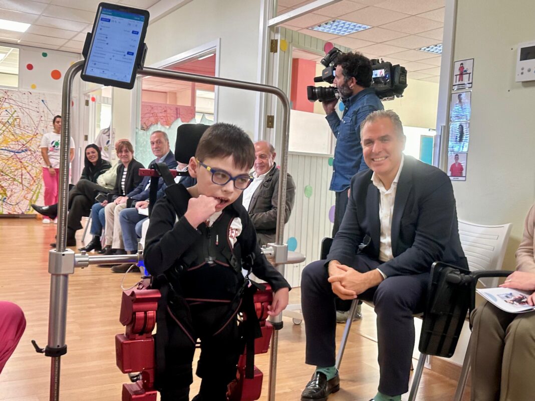 O vicepresidente da Deputación de Pontevedra, Rafa Domínguez, asistiu hoxe na sede de Amencer-Aspace en Pontevedra á presentación do primeiro exoesqueleto pediátrico da provincia, que pasa a formar parte dos recursos tecnolóxicos do servizo de rehabilitación externa da asociación de familias de persoas con parálise cerebral e outros trastornos neuro-motores. Domínguez coñeceu así de preto esta innovación robótica, que se adapta ao corpo dos máis pequenos e que, grazas á súa tecnoloxía permite camiñar a nenos e nenas que, doutra maneira, non poderían facelo.